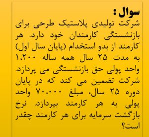 شرکت گلمهر برای بهبود وضع تولید خود به تغییر خط تولید نیاز دارد. سه پروژه A,B,C با خصوصیات زیر مطرح است . ارزش اسقاط در پایان عمر مفید برابر صفر است و حداقل نرخ جذب کننده ۱۰ درصد فرض می گردد. با استفاده از روش نرخ بازگشت سرمایه اقتصادی ترین پروژه را تعیین کنید ؟